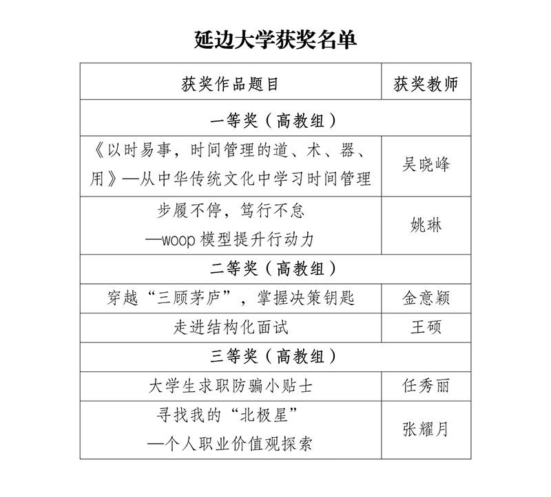 日前,由吉林省教育厅主办,高校毕业生就业指导中心承办的吉林省第十届高校职业发展与就业指导课程教学大赛落幕。全省共有368名选手进入决赛,我校教师团队在大赛中表现出色,荣获一等奖、二等奖、三等奖各2项,学校荣获优秀组织奖。